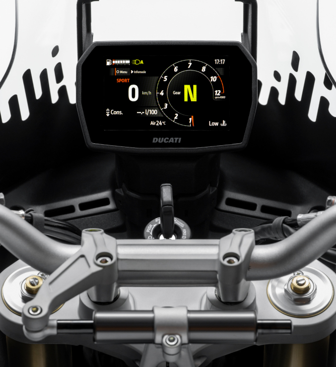 Panoul de comanda are o pozitie orizontala, permitand montarea usoara a sistemelor de navigatie si oferind o vizibilitate mai buna asupra zonei din fata motocicletei, ceea ce ajuta la identificarea obstacolelor in mersul in picioare. Noul DesertX are o inaltime a seii de 880 mm, care poate fi redusa la 840 mm prin utilizarea unei sei joase si a unui kit de suspensie.
