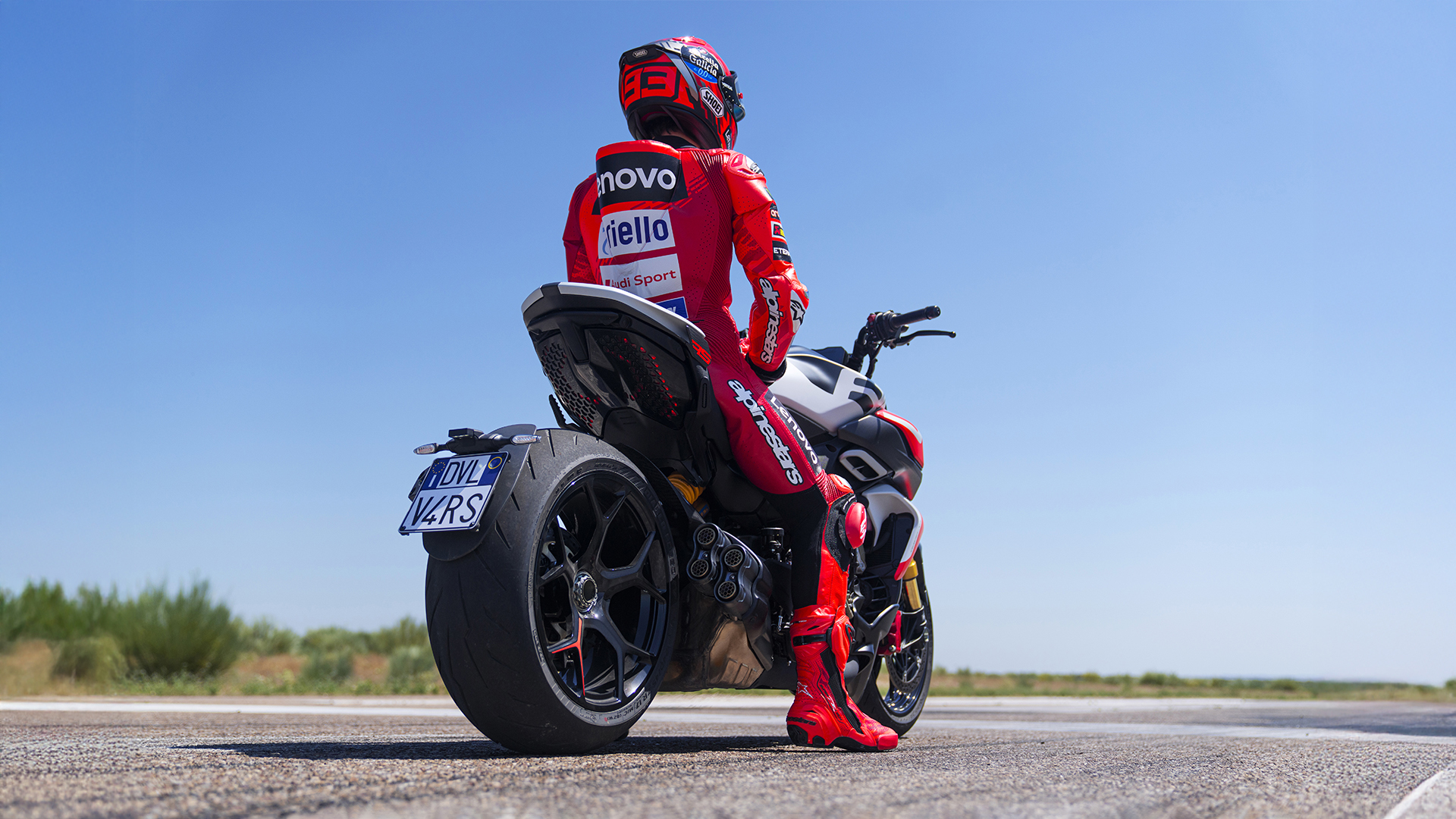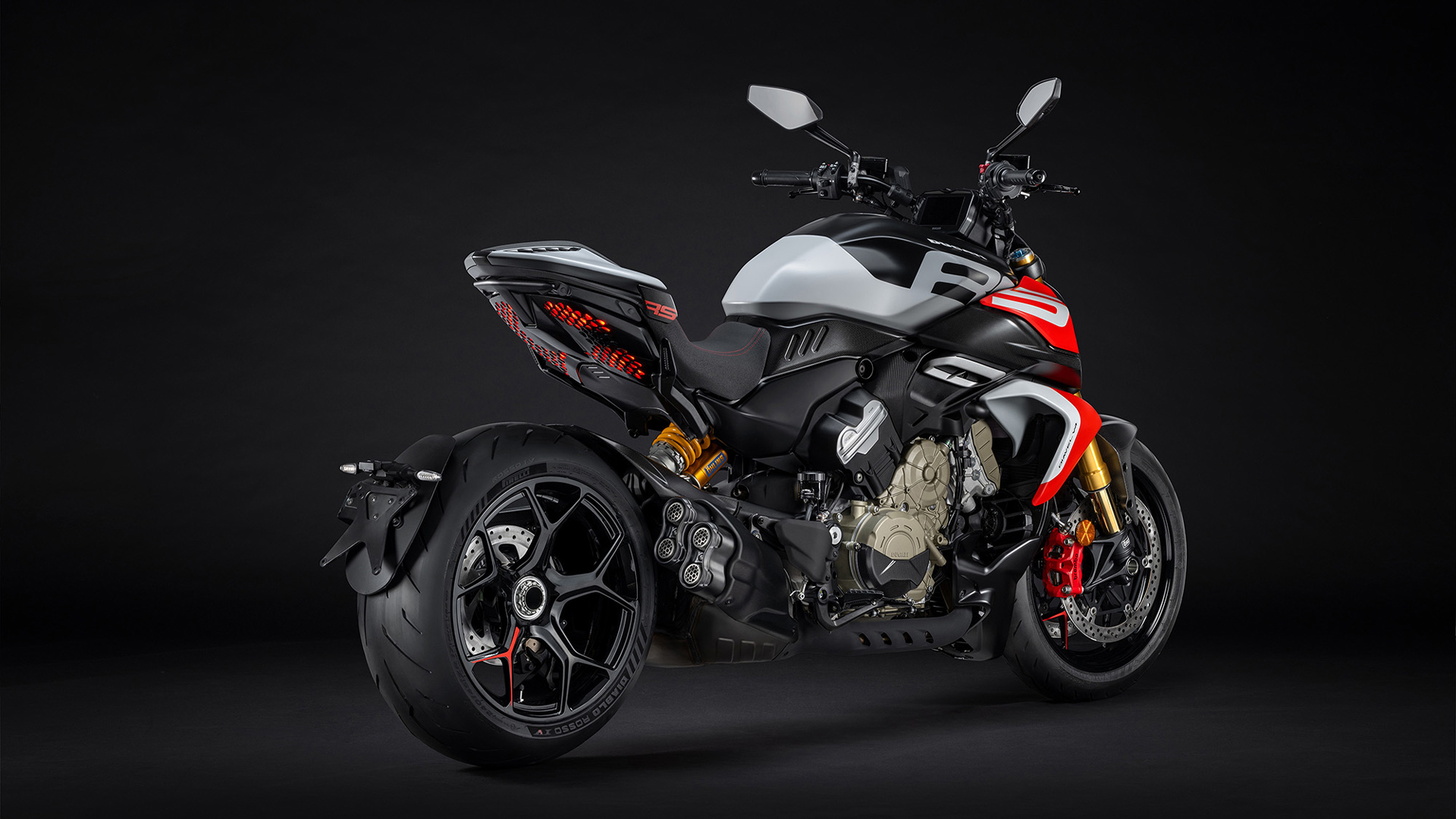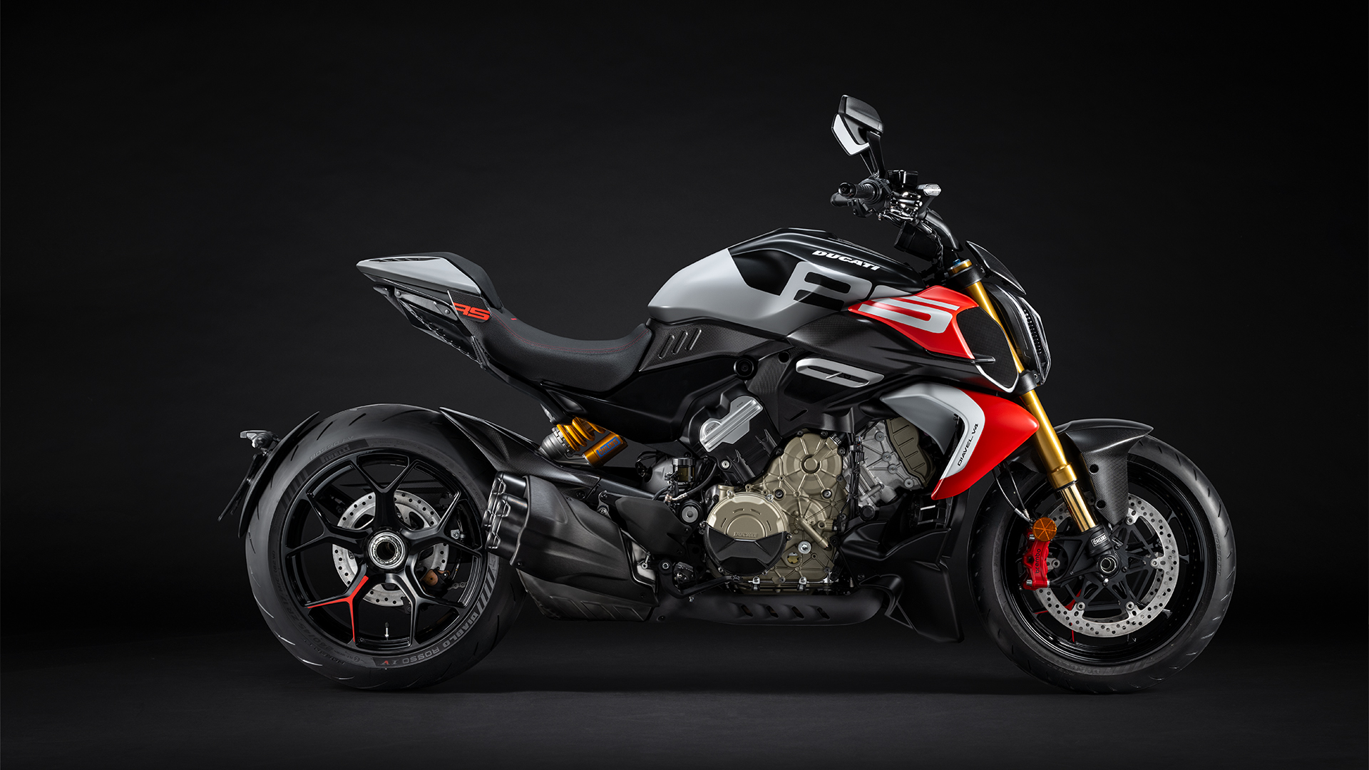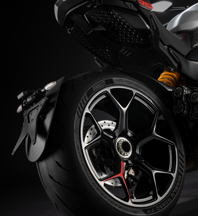 Scaunul soferului a fost proiectat special pentru Diavel V4 RS si este decorat cu cusaturi rosii. Capacul scaunului pasagerului cu logo RS adauga lejeritate vizuala liniei, dar poate fi inlocuit cu scaunul standard atunci cand pilotul doreste sa imparta emotiile condusului cu un pasager. Bascula din aluminiu pe o singura parte evidentiaza designul jantelor forjate cu cinci spite in forma de „Y”, oferind Diavelului RS un plus de exclusivitate. Stilul inconfundabil este accentuat de sistemul de evacuare cu patru iesiri, completat de etrierele de frana Brembo Stylema rosii din fata.