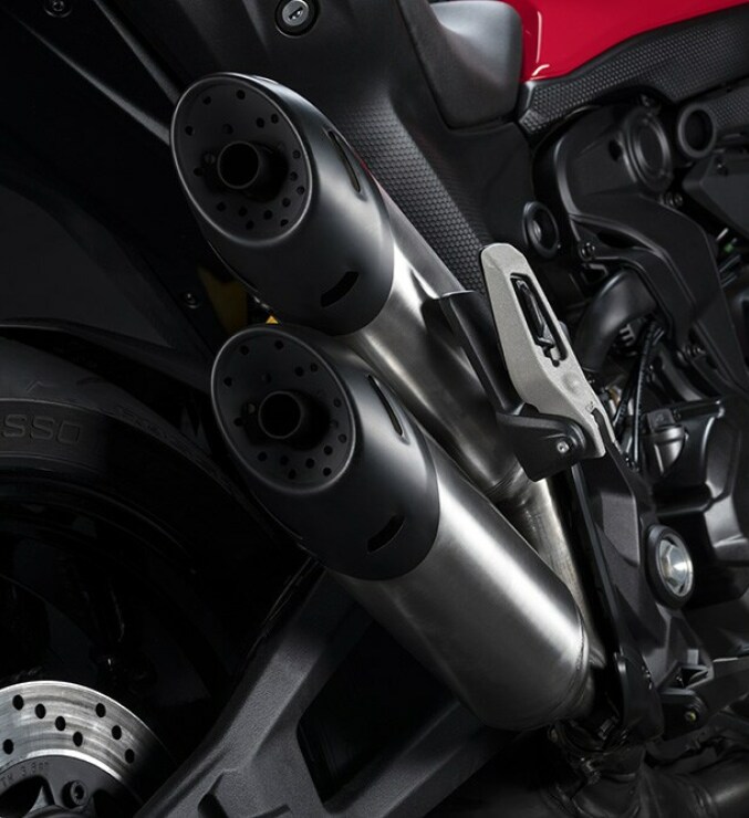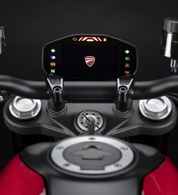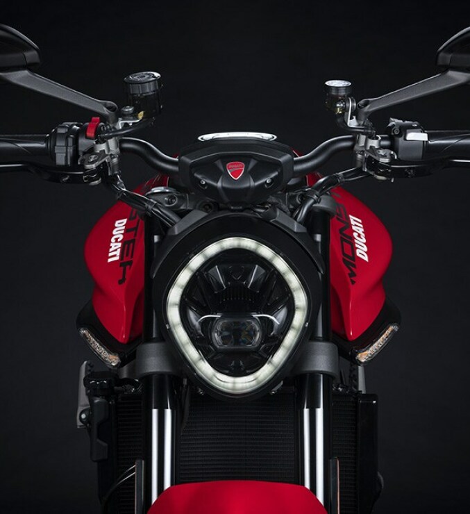 Cadrul usor din aluminiu, clar inspirat de Panigale V4, ridica designul modelului Monster la un cu totul alt nivel. Este un nou capitol in istoria modelului creat in 1993, care redefineste conceptul de sport naked. Silueta motocicletei este compacta, sportiva si rafinata, dar in acelasi timp moderna. Farul cu LED-uri a pastrat forma iconica, rotunda, iar semnalizarile „plutitoare” subliniaza musculatura rezervorului de combustibil.