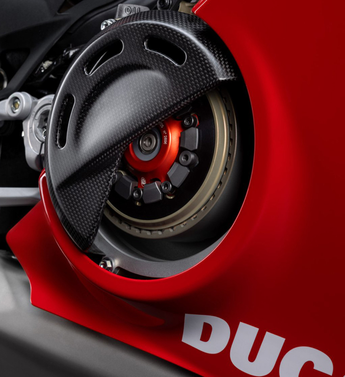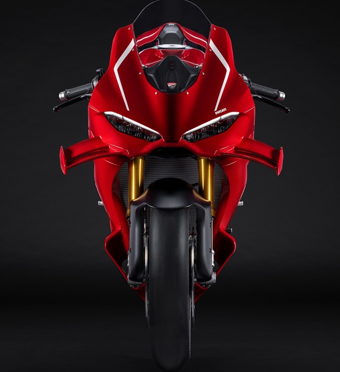 Carenele modelului Panigale V4 sunt mai aerodinamice si sporesc agilitatea motocicletei la schimbarea directiei, iar noile aripioare genereaza o forta de apasare mai buna. Incarcarea aerodinamica a crescut cu 25%, ceea ce se traduce printr-o crestere a fortei de apasare cu 4,8 kg la viteza de 270 km/h si 6 kg la 300 km/h. Rezultatul este o imbunatatire semnificativa a stabilitatii la accelerare si a preciziei la viteze mari.