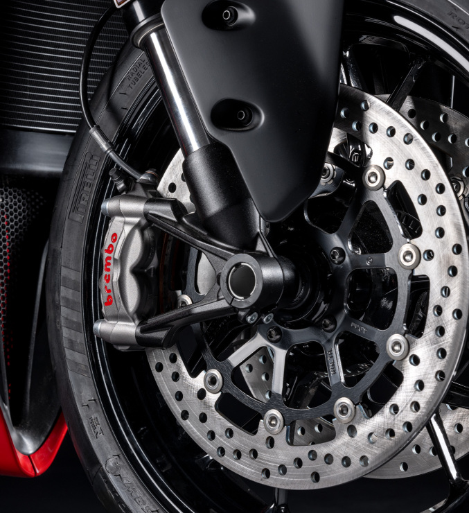 Partea frontala a motocicletei aminteste de noua Panigale V4. Farul Full-LED are lumini DRL, care ii ofera acelasi aspect agresiv. Designul rezervorului de combustibil a fost analizat din punct de vedere al dimensiunii si mai ales al formei, pentru a ajuta pilotul in condusul sportiv. Si aici se vede inspiratia de la Panigale V4, dar rezervorul a fost adaptat la noul motor si optimizat ergonomic pentru a reduce tensiunea asupra incheieturilor, pastrand totodata un control excelent in viraje. Partea din spate a primit, de asemenea, un design inspirat de Panigale V4 si se integreaza lin cu rezervorul, creand un efect monolitic clar inspirat de modelul 916. Lampa spate complet LED este impartita in doua parti. Esapamentul, care se termina cu doua tobe de esapament amplasate sub sa, aminteste de traditia de curse Panigale si subliniaza spiritul sportiv al motocicletei. Designul noilor roti cu spite este o reinterpretare moderna a aspectului iconic al rotilor cu trei spite de la Marchesini. Culoarea neagra creeaza un efect de contrast cu rosul Ducati.