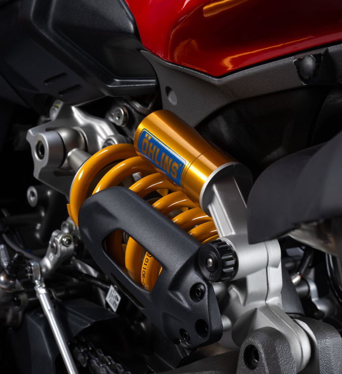 Partea frontala a motocicletei aminteste de noua Panigale V4. Farul Full-LED are lumini DRL, care ii ofera acelasi aspect agresiv. Designul rezervorului de combustibil a fost analizat din punct de vedere al dimensiunii si mai ales al formei, pentru a ajuta pilotul in condusul sportiv. Si aici se vede inspiratia de la Panigale V4, dar rezervorul a fost adaptat la noul motor si optimizat ergonomic pentru a reduce tensiunea asupra incheieturilor, pastrand totodata un control excelent in viraje. Partea din spate a primit, de asemenea, un design inspirat de Panigale V4 si se integreaza lin cu rezervorul, creand un efect monolitic clar inspirat de modelul 916. Lampa spate complet LED este impartita in doua parti. Esapamentul, care se termina cu doua tobe de esapament amplasate sub sa, aminteste de traditia de curse Panigale si subliniaza spiritul sportiv al motocicletei. Designul noilor roti cu spite este o reinterpretare moderna a aspectului iconic al rotilor cu trei spite de la Marchesini. Culoarea neagra creeaza un efect de contrast cu rosul Ducati.