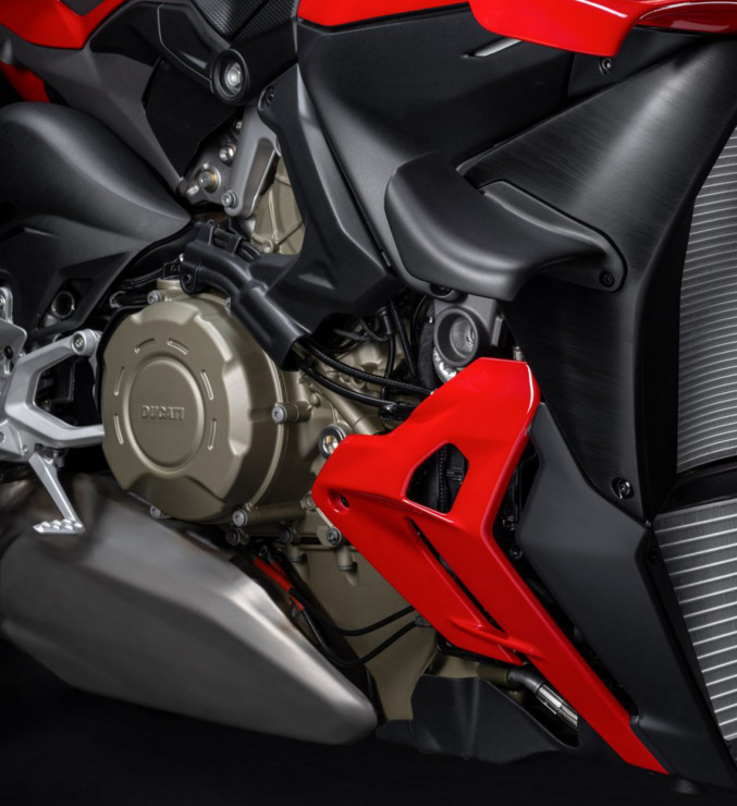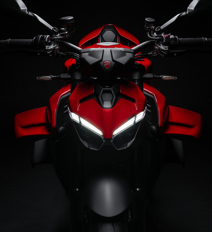 Desigur, nu puteau lipsi aripioarele biplan, un element caracteristic al Streetfighter V4 inca de la prima sa versiune. Comparativ cu modelul anterior, acestea sunt mai eficiente (+17 kg forta de apasare la 270 km/h) si integrate cu linia motocicletei intr-un mod mai rafinat. Aripioarele au permis crearea unei motociclete agile, dar in acelasi timp stabila la viteze mari. Esapamentul pozitionat sub motor pastreaza stilul caracteristic modelelor sportive Ducati.